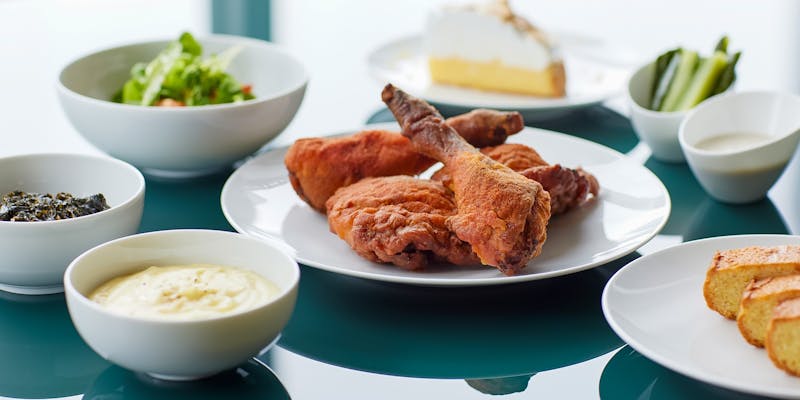 ■コブサラダ ケールドレッシング ■フライドチキン ■ケールブレゼ ■マッシュポテト ■コーンブレッド ■自家製ピクルス ■ランチドレッシング ■レモンメレンゲパイ